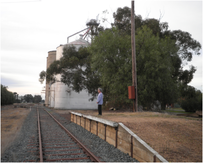 Local resident Beryl Ilsley waiting for a train on St James siding. St James Station was to the left of the photo on the main line and today is an elevated mound of earth. The Benalla – Yarrawonga line is now used for the movement of grain deposited by farmers in the operating silos along the line. The passenger rail service closed in the 1980s and now a limited bus service operates between Benalla and Yarrawonga.