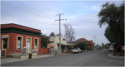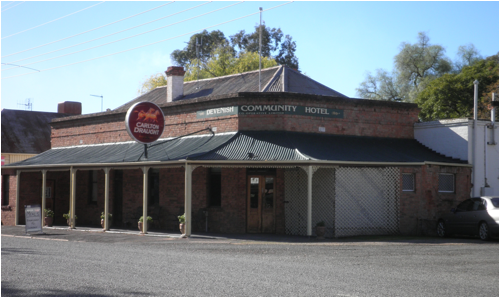 The surveyed town of Devenish never caught on. Apparently only one building was built there. It was on the Benalla-Tocumwal Road and it became a hotel for travellers and locals. However after the rail went through in 1883, a town grew by the railway station (about 3 km NE) and at some point the settlement at the railway station became Devenish and the original area became Devenish West. The surveyed area is now part of farming properties.