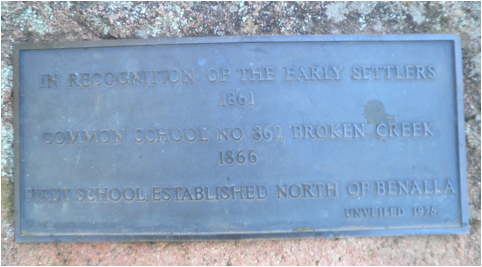 Settlers began to occupy the Devenish district in the 1860s. It seems many came from the south west of Victoria – the Western District, Bacchus Marsh, Ballan, etc. As land was selected, those following would have to select land further to the north east. Hence the Devenish district was selected before St James. The still operating Broken Creek Primary School (15 km south of Devenish and 6 km north of the Benalla-Shepparton Road) opened in 1866. There is a bronze plaque at the school on a sizeable granite boulder. The fact that a school was required is a strong indication the early pioneers mentioned on the plaque were selectors, not squatters.